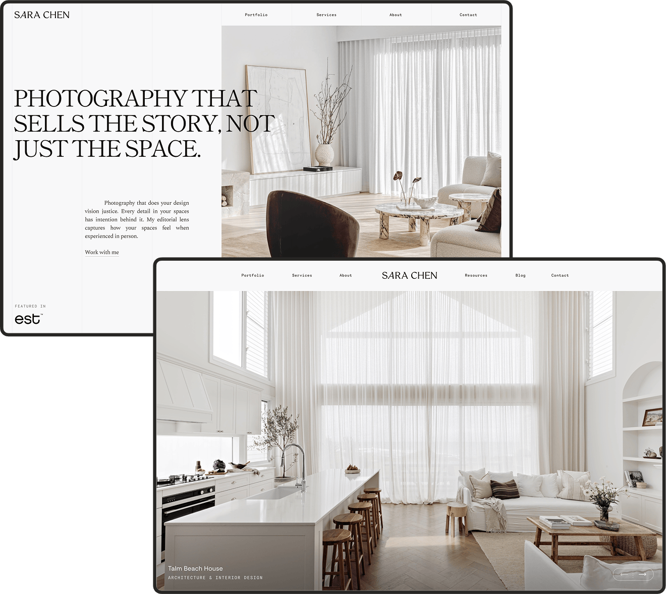 A premium, done-with-you website — design, copy & SEO included — launched in 5 days. Built for interior photographers who want to feel proud of their site and book dream clients.